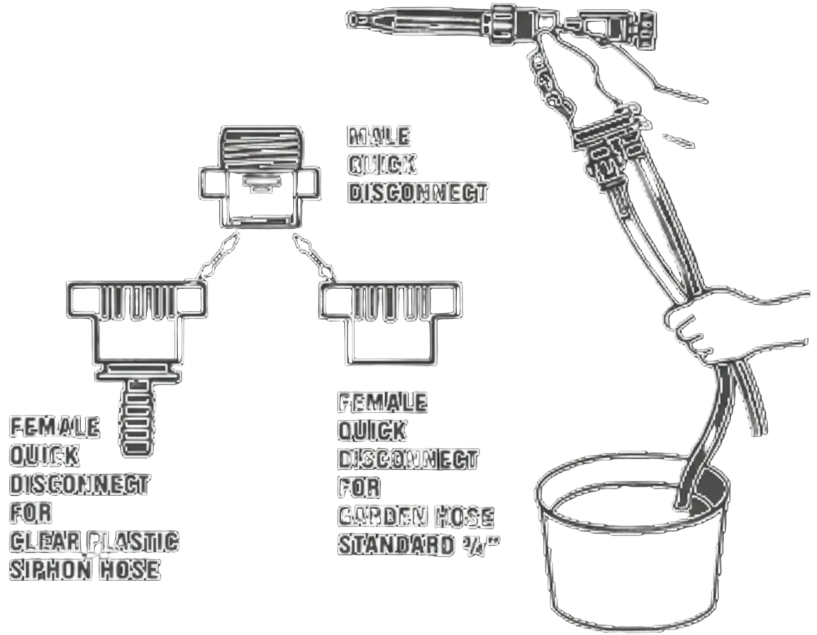 Connect air inlet to air hose with standard ¼" pipe thread coupling or with a quick coupler, use ½" hose to assure the proper volume of air to the washer, connect water inlet to standard water hose of good quality with standard hose type coupler.